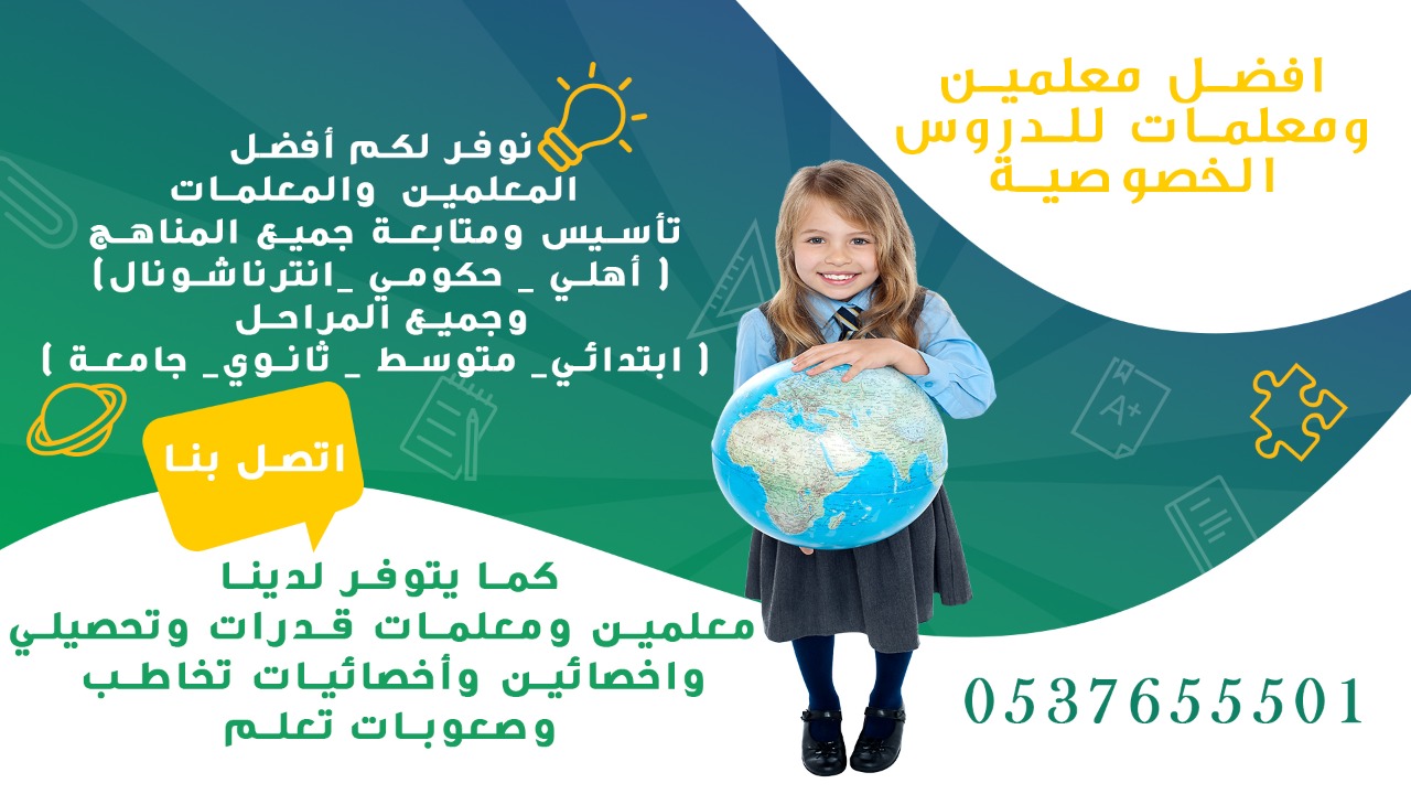 معلمة تأسيس ابتدائي شرق الرياض 0537655501 معلمة خصوصية في جميع المواد لجميع المراحل بكل أنحاء الرياض ولدينا ايضا نخبة من أفضل المعلمين والمعلمات للتدريس خصوصي بأفضل الأسعار للمتابعات اليومية والمراجعات من تمهيدي حتى الجامعة للمناهج الخاصة بالمدارس أهلي وحكومي وإنترناشيونال والجامعات في كافة المواد معلمين ومعلمات جميع التخصصات (حكومي - أهلي - انتر ناشيونال) من أكفاء وأفضل معلمين ومعلمات المملكة لجميع المراحل ابتدائي - متوسط - ثانوي - جامعات أفضل الأسعار وجميع التخصصات (انجلش - رياضيات - مواد علمية - احصاء واقتصاد - دورات قدرات كمي ولفظي - تحصيلي يوجد لدينا نخبة من المعلمين والمعلمات على مستوى عالي في التأسيس والمتابعة ومراجعة الاختبارات في كل المواد لجميع المراحل التعليمة المختلفة وجميع الفئات والمراحل العمرية ابتدائي متوسط ثانوي جامعة سمة تحضيرية معلمات تأسيس ومتابعة خبرة في تأسيس القراءة والكتابة ومتابعة مواد المرحلة المتوسطة خبرة طويلة في المناهج السعودية معلمات ممتازة لتأسيس القراءة والكتابة للمراحل الابتدائية والمتوسط خبره 15سنه وسوف تلاحظ النتيجة ف القراءة من اول شهر معلمات صعوبات تعليم وتأسيس تعليم القراءة والكتابة بصوره سهله معالجة صعوبات التعلم وتشتت الانتباه ماجستير بالتربية الخاصة واللغة العربية خبرة15 سنه بالسعودية (بجدة) معلمات لغة عربية ومتابعات جميع المواد ابتدائي ومتوسط وذو قدرة على التأسيس بجدة نوفر معلمين ومعلمات لجميع المراحل الدراسية يجون البيت. خبرة كبيرة جدا بالمناهج المطورة وطرق التدريس ابتدائي ومتوسط وثانوي. حكومي. أهلي. انترناشونال معا نضمن النجاح والتفوق إن شاء الله يتوفر لدينا ايضا مدرسات لغة إنجليزية بجدة للسنة تحضيرية، للثانوي، ايلتس، توفل مدرسة انجليزي تجي للبيت معلمه تأسيس انجليزي بجدة مدرسه بريطانية انجليزي بريطاني تجي البيت بجدة مدرسة لغة إنجليزية لجميع المراحل، خبرة 10 سنوات في تدريس اللغة الانجليزية للسنة التحضيرية بالجامعات السعودية، تدريب الكبار والصغار على اتقان اللغة الإنجليزي (قراءة، استماع، كتابة، محادثة) التحضير لاختبارات ايلتس والتوفل، تدريس مناهج لغة إنجليزية، منهج سعودي ومصري وإنترناشونال)، تدريس الرياضيات والفيزياء باللغة الإنجليزية للتعليم الجامعي وما قبل الجامعي، للتواصل واتس أو جوال 0537655501 للتواصل 0537655501 او على الواتساب مباشرة من خلال هذا الرابط http://iwtsp.com/966537655501 تابعونا على السوشيال ميديا Facebook: https://www.facebook.com/mo3lmaksa