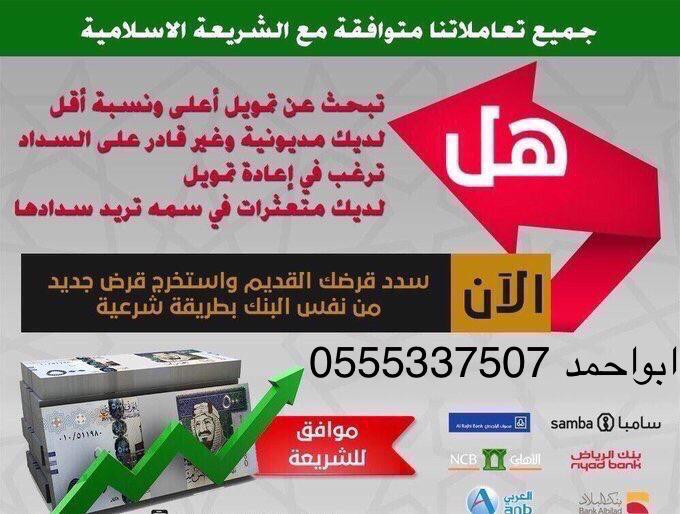 تسديد القروض البنكية تبحث عن تمويل أعلى ونسبة أقل لديك مديونية وغير قادر على السداد ترغب في اعادة تمويل لديك متعثرات في سمه وتريد سدادها 0555337507 نسدد قرضك القديم ونستخرج قرض جديد فروعنا جميع مناطق المملكة بطريقه شرعية اسلامية للأستفسار والتواصل 0555337507